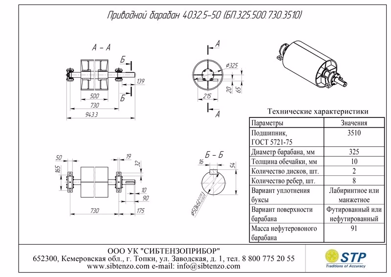 Шир. ленты В, мм Типоразмер приводного барабана Допуст. нагрузка Sб, даН Условное обозначение подшипника Размеры, мм Масса, кг Чертеж
